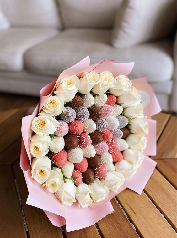 Состав:- 17 белых роз- клубника